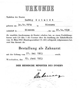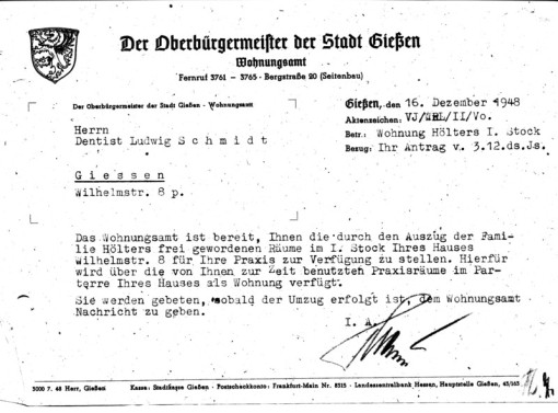 Da in dem zerstörten Nachkriegsdeutschland Wohnraum knapp war, wurden durch das Wohnungsamt Zwangseinquartierungen in der Wilhelmstraße vorgenommen. Durch einen "Handel" mit einem der einquartierten Mieter erhielt Ludwig Schmidt die Möglichkeit in seinem Elternhaus eine Praxis im Erdgeschoß zu eröffnen:
